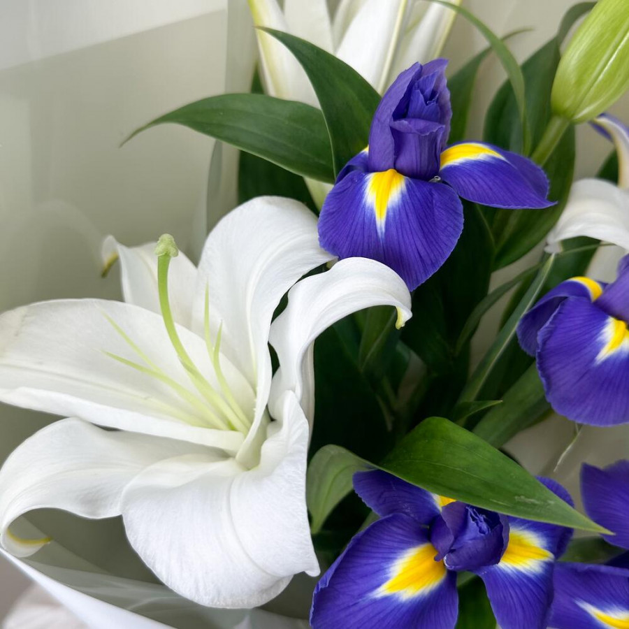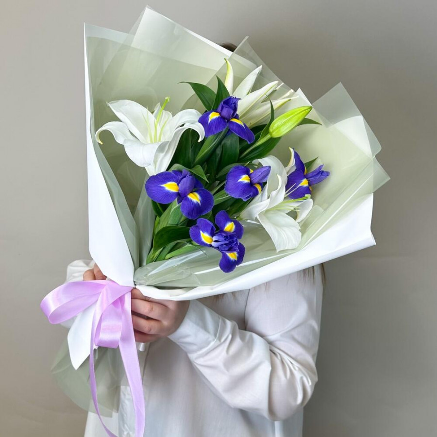 На фото букет «магия лилий». В составе: лилия 1 шт, ирис 5 шт, дизайнерская упаковка 1 шт, атласная лента 1 шт, . Все цветы свежие и ароматные, букет красиво оформлен и отлично подходит для подарка. Доступна доставка цветов или самовывоз.